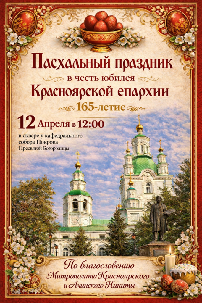 12 апреля 2026 г. в сквере имени В. И. Сурикова у кафедрального собора Покрова Пресвятой Богородицы, по благословению митрополита Красноярского и Ачинского Никиты, состоится I Пасхальный Покровский фестиваль, приуроченный к 165-летию Красноярской епархии.